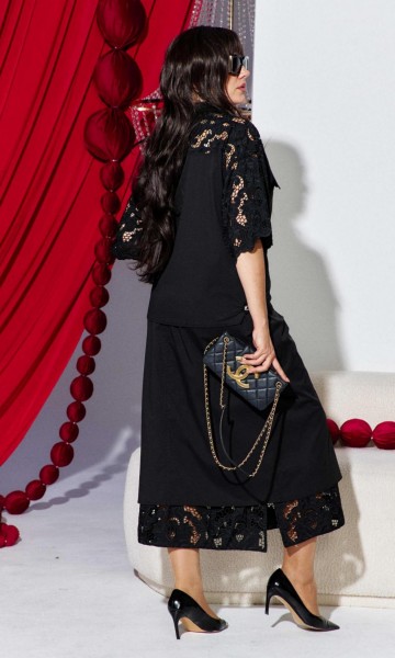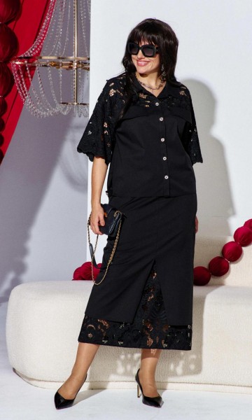 Костюм юбочный женский, состоящий из блузки и юбки. Комбинация однотонного хлопка и вышитого гипюра в тон создаёт ощущение монолитности и изысканности. Верх и низ костюма образуют единое целое: простая, сдержанная геометрия блузы подается как холст для элегантности юбки, превращая костюм в идеальный выбор для событий, где важна сдержанность и сила стиля. Блузка свободного силуэта, укороченная, с центральной застёжкой на петли-пуговицы по планке, низ в блузке ассиметричный. Воротник в блузе рубашечного типа. По переду блузки отрезные кокетки из отделочной ткани в тон- гипюра на просвет, декоративными клапанами. Спинка в блузке с отрезной кокеткой из отделочной ткани в тон-гипюра на просвет. В боковых швах блузки разрезы с декоративным элементом в виде паты, фиксирующейся отделочной пуговицей. Рукав в блузке втачной, длиной ¾, из отделочной ткани-гипюра с фестонами по низу. Юбка прямого силуэта, длины миди, с застёжкой на тесьму-молнию в гульфике и пуговицу в поясе, по переду юбки средний шов переходящий в разрез, и прорезные карманы. Заднее полотнище юбки со средним швом. Пояс притачной, со вставкой эластичной тесьмы-резинки в бочках. Юбка на подкладке, к подрезу подкладки притачивается деталь из отделочной ткани-гипюра в тон.