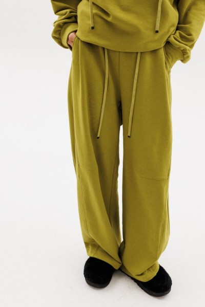 Комплект: джемпер+брюки. Комплект выполнен из трикотажного полотна. Джемпер прямого силуэта, покроя "oversize" длиной до линии бедер. Спереди застежка на молнию. Воротник-стойка. Плечевой шов удлинен. Рукав рубашечного покроя, одношовный, расширенный и присборенный к низу. Низ рукава на притачной манжете. Низ джемпера на эластичной тесьме с фиксаторами. Джемпер декорирован вышивкой по переду. Брюки прямого силуэта, длиной в пол, на притачном поясе с эластичной тесьмой. Спереди боковые карманы с фигурным входом, петли в поясе, в которые втянут шнур из основной ткани, коленные вытачки, складки. Сзади справа накладной карман.
