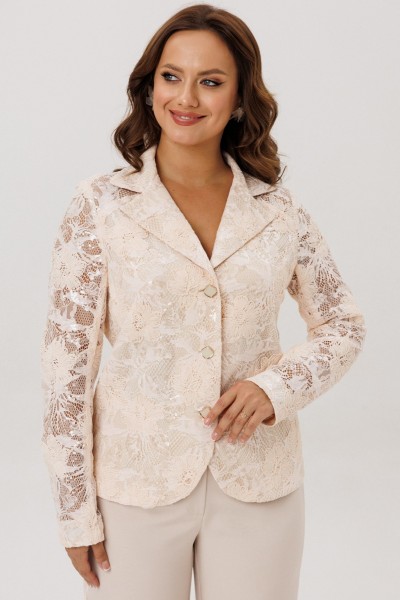 Жакет полуприлегающего силуэта, нижние части переда и спинки на подкладке, кокетка и рукава без подкладки. По переду нагрудные вытачки, центральная застежка на петли-пуговицы. По спинке талиевые вытачки. Горловина оформлена воротником пиджачного типа с лацканом. Рукава втачные двухшовные.