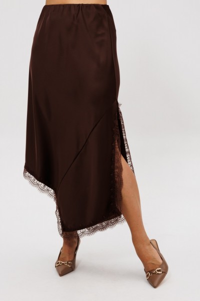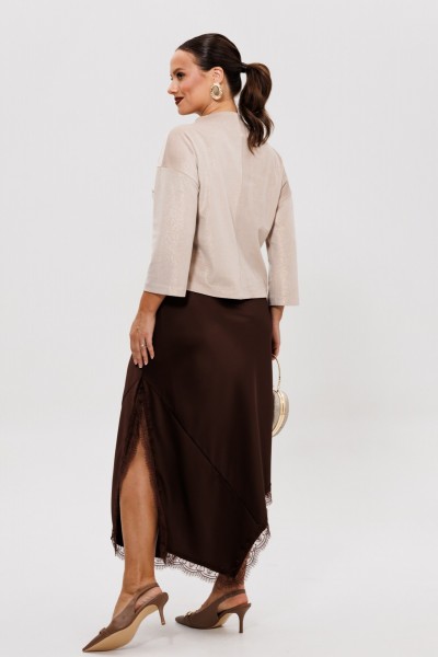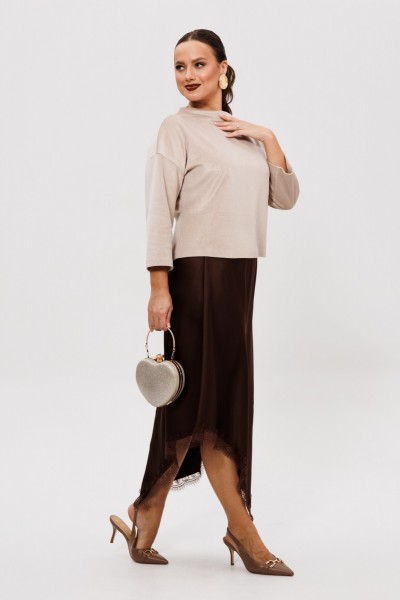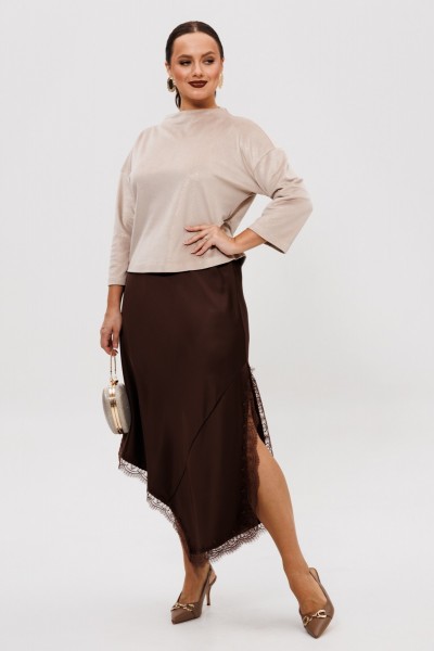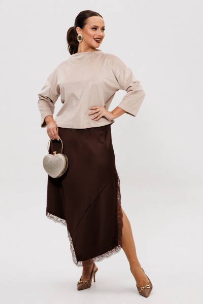 Юбка расширенная к низу из струящегося шелка «Армани» (тянется), ассиметричная по линии низа с отрезным клином. Низ юбки декорирован французским кружевом. Верхний срез оформлен поясом с эластичной резинкой.