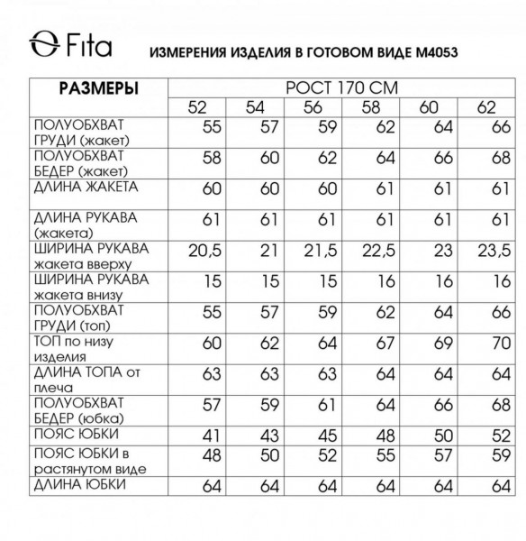 Состав ткани: жакет: 60% вискоза, 36% полиамид , 4% спандекс; юбка: 70% полиэстер, 30% вискоза; блузка: 95% искусственный шелк, 5% спандекс.