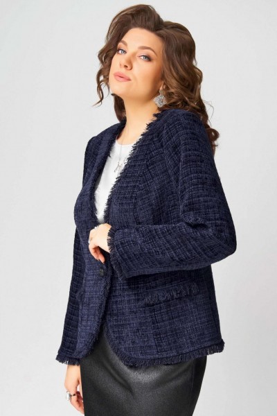 Жакет выполнен из твидовой ткани на подкладке полуприлегающего силуэта. Застежка в жакете однобортная на пуговицу, по полочке - рельефы, карман-обманка в виде настроченной трепки, по спинке рельефы. По краю борта и низа жакета вставлена трепка, рукав втачной двухшовный, по низу рукава вставлена трепка.