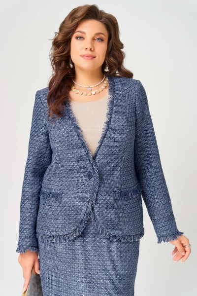 Жакет выполнен из твидовой ткани на подкладке полуприлегающего силуэта. Застежка в жакете однобортная на пуговицу, по полочке - рельефы, карман-обманка в виде настроченной трепки, по спинке рельефы. По краю борта и низа жакета вставлена трепка, рукав втачной двухшовный, по низу рукава вставлена трепка.