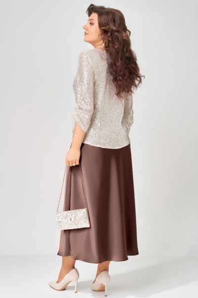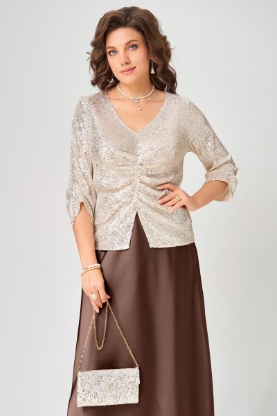 ""Зария"" — сияющий акцент вашего новогоднего образа. Блузка, расшитая пайетками, ловит свет при каждом движении, а сатиновая юбка добавляет торжественности и утончённости. Идеальный дуэт для праздников, когда хочется блистать. Сумка-клатч ""Зария"" — это не просто аксессуар, а настоящее украшение вашего образа.