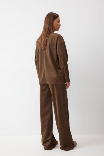 Джемпер прямого силуэта из костюмной ткани. Горловина округлая, на спинке застежка в среднем шве. Рукав со спущенной линией плеча длинный. По низу джемпера в боковом шве шлица.