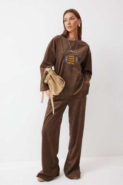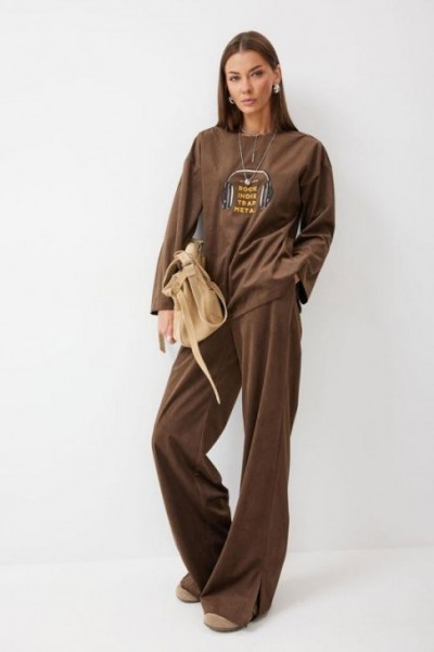Брюки прямого силуэта из костюмной ткани. По верху брюк притачной пояс на резинке с декоративной нашивкой. На передних половинках обработаны карманы.