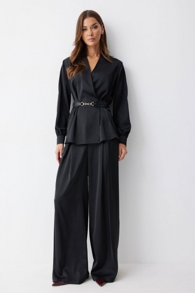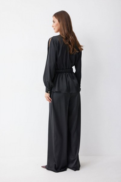 Брюки прямого силуэта расширенные книзу из струящейся ткани. По верху брюк притачной пояс с застежкой на петли и пуговицы. На передних половинках обработана застежка молния в среднем шве. На передних половинках карманы и декоративные складки. По поясу задних половинок брюк резинка и вытачки.