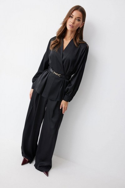 Блузка полуприлегающего силуэта расширенная книзу из струящейся ткани. Рукав втачной, с разрезом в области плеча, по низу манжета с застежкой на петли и пуговицы. Блузка отрезная по линии талии. По переду от подреза вверх и вниз декоративные складки. На спинке в подрез вставлена резинка. В комплект входит съемный ремень. Обращаем ваше внимание, что фурнитура может отличаться от фото.