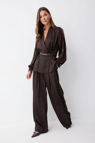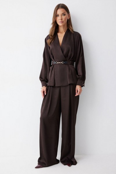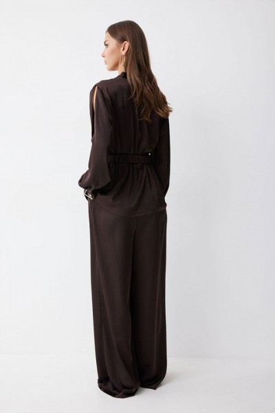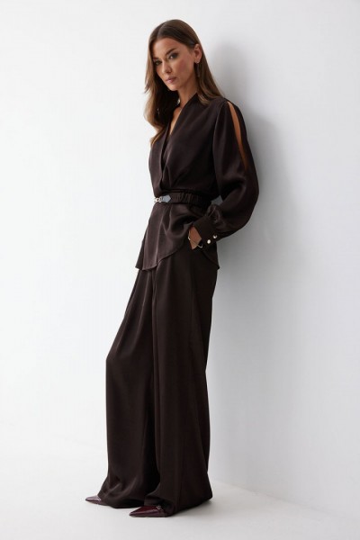 Брюки прямого силуэта расширенные книзу из струящейся ткани. По верху брюк притачной пояс с застежкой на петли и пуговицы. На передних половинках обработана застежка молния в среднем шве. На передних половинках карманы и декоративные складки. По поясу задних половинок брюк резинка и вытачки.