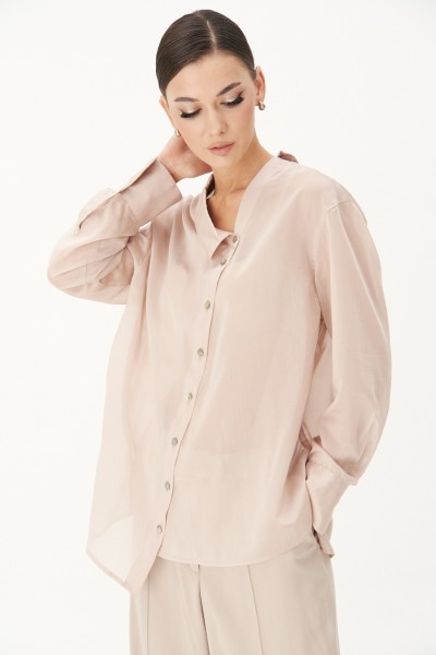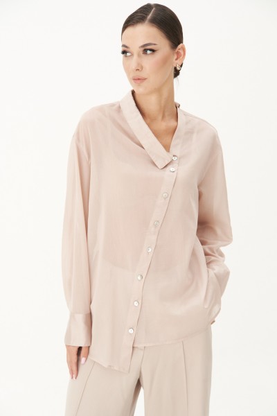 Блуза свободного кроя с рубашечным рукавом, ассиметричной застёжкой, разноуровневым низом, рубашечным воротником.