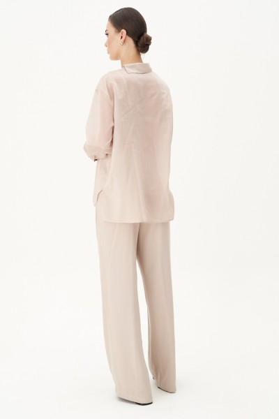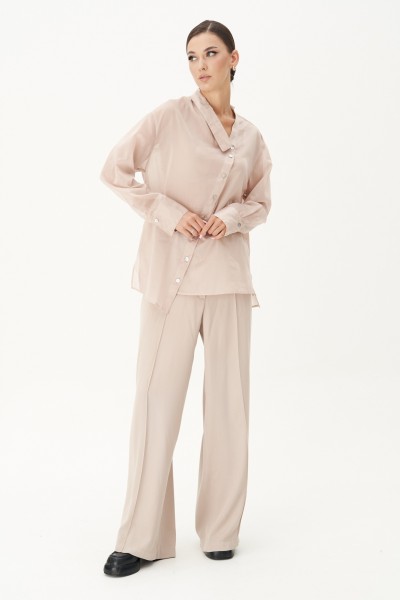 Модные тенденции 2024-2025 буквально стёрли границы правил в составлении тотал-луков и вдохнули в термин "монохром" его истинный смысл. Великолепная двойка: брюки и блуза в одном цвете, но из разнофактурных материалов. Нарочитая женственность, подчеркнутая полупрозрачностью верха и пластичностью брюк.