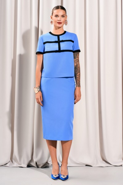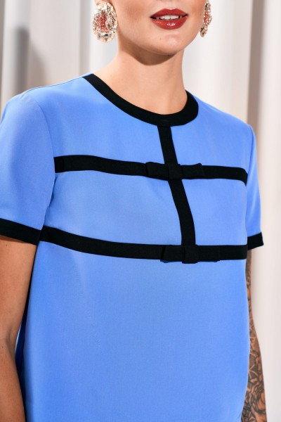 Блуза с округлым вырезом горловины. Перед с декоративными отрезными деталями и бантами контрастного цвета. Спинка с потайной молнией в среднем шве. Рукава втачные с контрастной отделочной деталью по низу.
