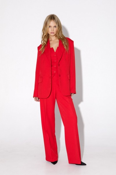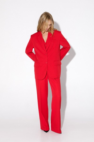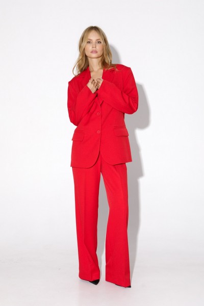 Костюм-двойка из оверсайз жакета с расширенной линией плеч и прямых брюк-палаццо со стрелками.