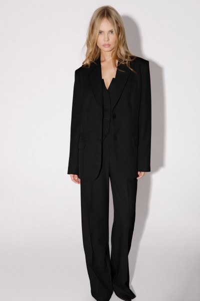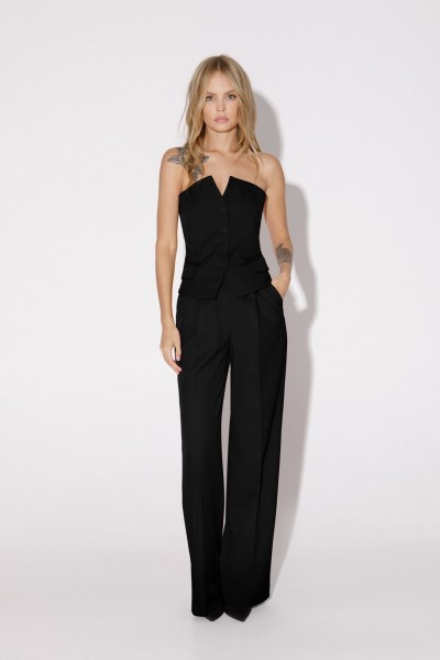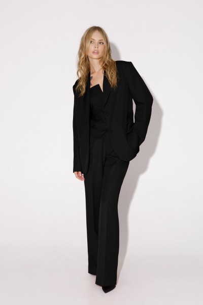 Костюм-тройка из оверсайз жакета, топа-корсета и прямых брюк-палаццо со стрелками.
