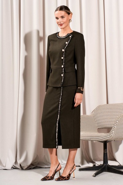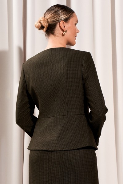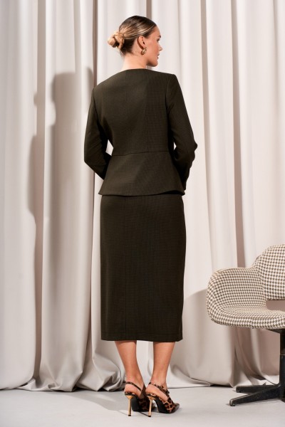 Жакет с округлым вырезом горловины и смещённой застёжкой на петли и пуговицы. Изделие с отрезной баской. Перед с клапанами от баски. Спинка со средним швом и талиевыми вытачками до баски. Рукава втачные. По горловине и краю борта располагается декоративная тесьма. Жакет на подкладке.