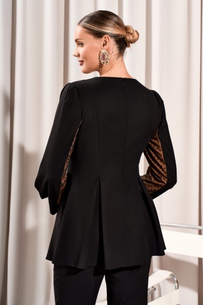 Свитшот с округлым вырезом горловины и складками от рельефов по переду и спинке. Перед со стразами в верхней части. Спинка с потайной молнией в среднем шве. Рукава втачные со складками по окату и со складками нижней части рукава, и с деталью из декоративной сетки и подложки.