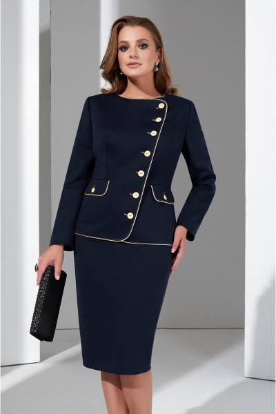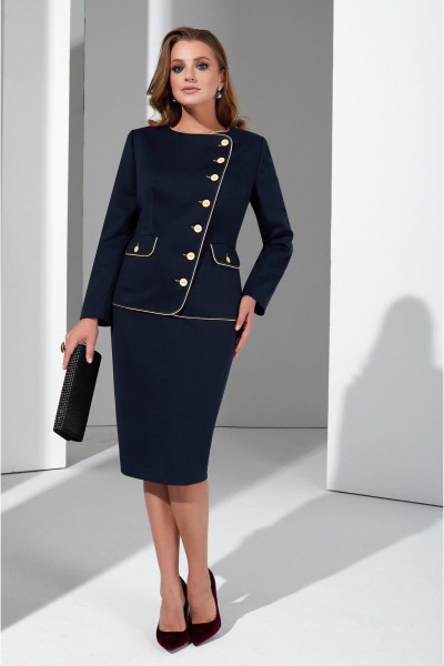 Дизайнерский юбочный костюм выполнен в минималистичном стиле с акцентом на яркие пуговицы и контрастный кант. Ассиметричный жакет с округлым вырезом и отрезными бочками. Перед оформлен полурельефами до входа в карман. От горловины по краю борта и низу жакета вставлен контрастный кант. Карманы с клапаном и листочкой (в шов обтачивания клапана вставлен кант). Спинка со средним швом и отрезными бочками. Рукава втачные свободные. Юбка карандаш с отрезным поясом по бокам на резинке, застежка на потайную молнию в среднем шве спинки, по низу юбки шлица. Жакет и юбка на подкладке.
