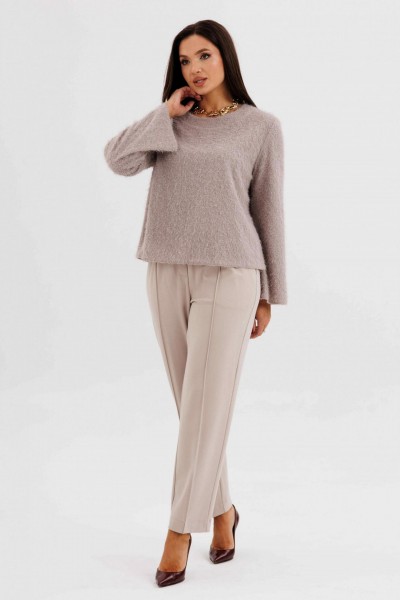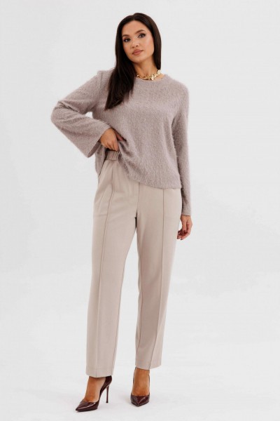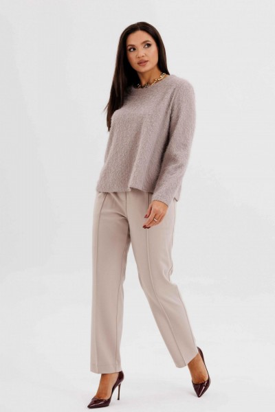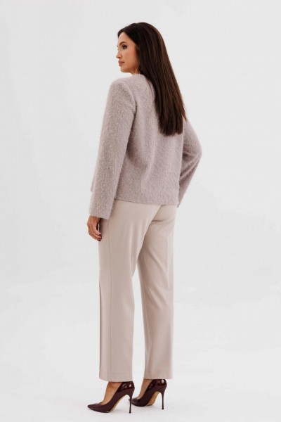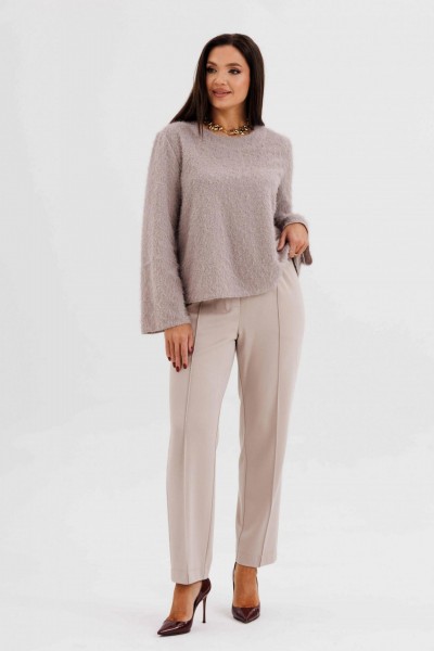 Блуза выполнена из нежного трикотажа с лёгким ворсом — материал красиво драпируется и придаёт образу уют. Брюки классического кроя с высокой посадкой и застроченными стрелками визуально вытягивают силуэт и создают безупречную посадку.