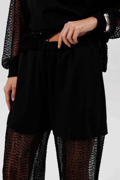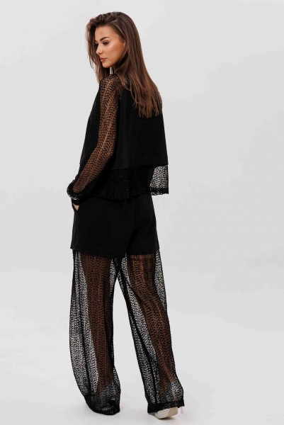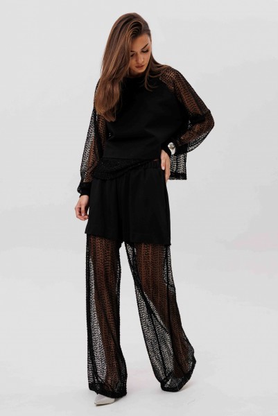 Современный брючный комплект, который создаёт эффект многослойности и лёгкого сияния. Джемпер выполнен из мягкого, комфортного вискозного полотна с нейлоном и дополнен воздушными рукавами из мерцающей сетки с россыпью микропайетки. Брюки на удобном эластичном поясе имеют прозрачную нижнюю часть в тон — подвижную, блестящую и подчёркивающую силуэт. Стильное решение для тех, кто ценит тренды и оригинальное звучание образа.
