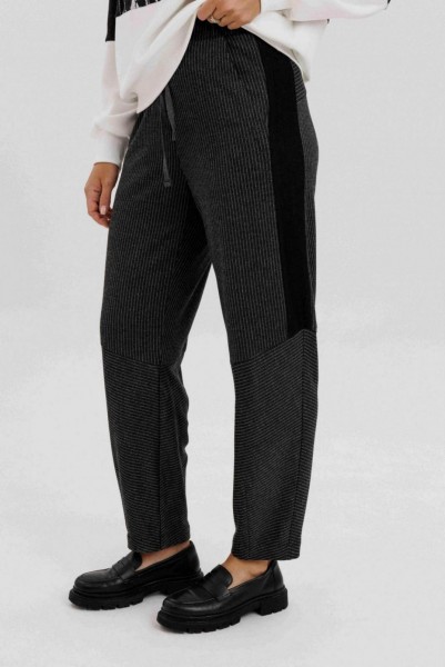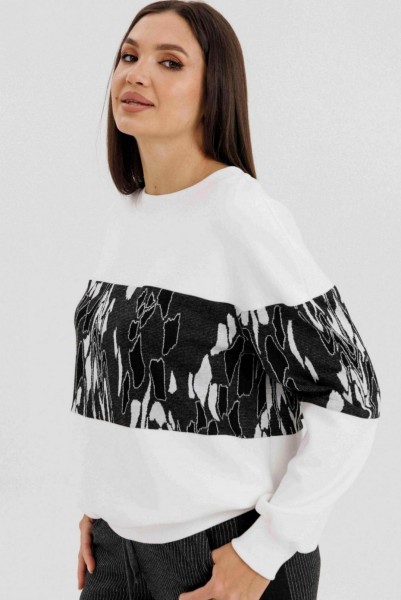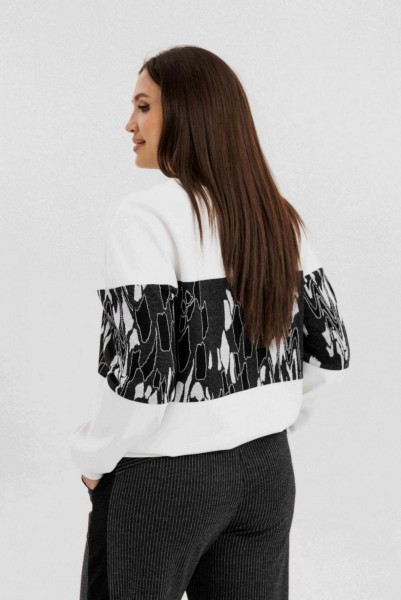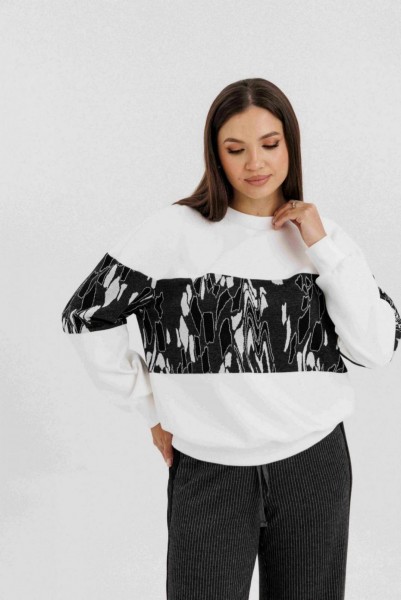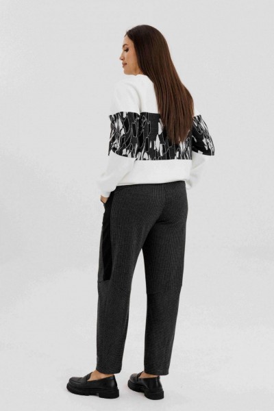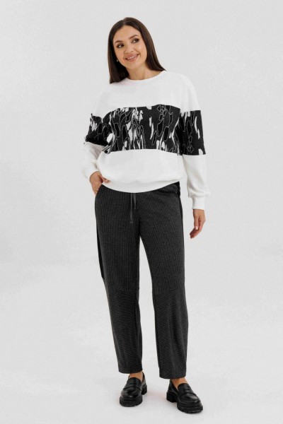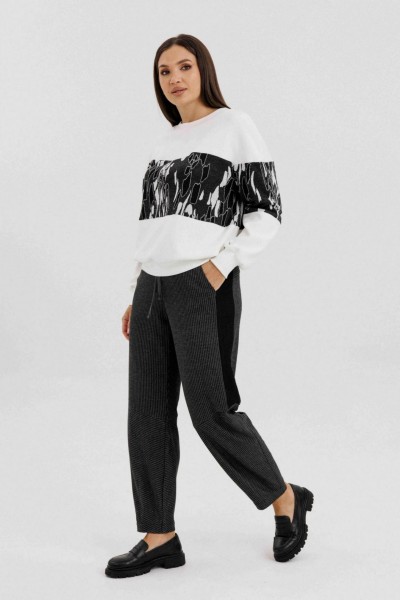 Свитшот украшен эффектным контрастным принтом в чёрно-белой гамме, придающим образу динамику и современное звучание. Брюки со средней посадкой и лёгким заужением к низу обеспечивают свободу движений и идеально сидят по фигуре.