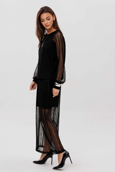 Юбка макси гармонично поддерживает дизайн: плотная внутренняя часть обеспечивает комфорт и уверенность, а длинная прозрачная нижняя вставка из мерцающей сетки добавляет загадочности и женственности. Комплект смотрится нарядно, но остаётся практичным — идеален как для вечерних выходов, так и для особых событий, где хочется выглядеть эффектно, но без излишнего пафоса.