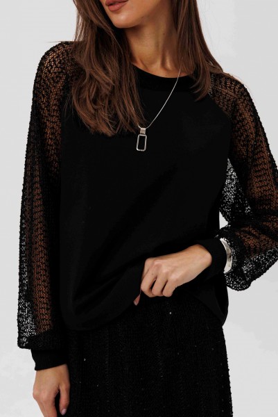 Элегантный юбочный комплект, созданный для тех, кто ценит сочетание комфорта и эффектного стиля. Верх выполнен из мягкого, комфортного вискозного полотна с нейлоном, приятного к телу и отлично удерживающего форму. Лёгкая воздушность образу придают полупрозрачные мерцающие рукава, выполненные из сетки с вкраплением микропайетки — они создают утончённую игру света при движении.