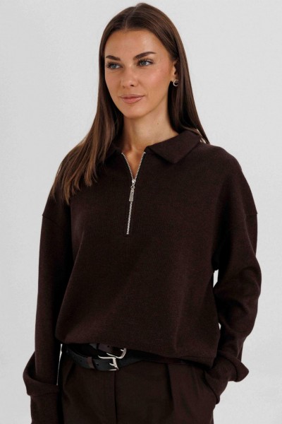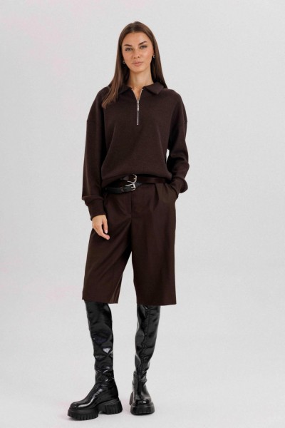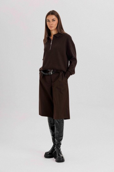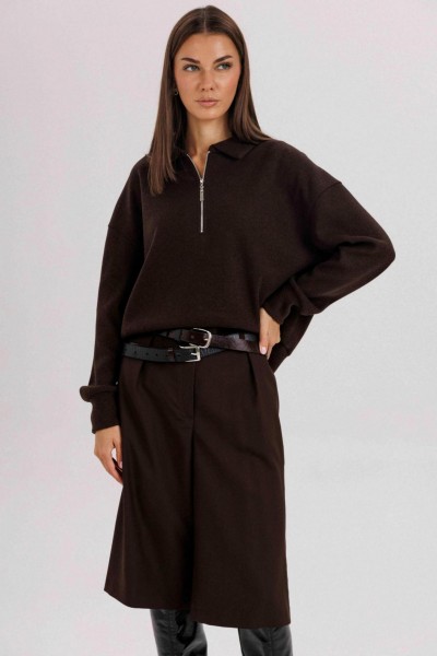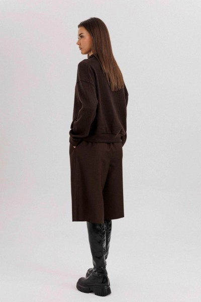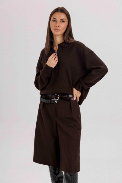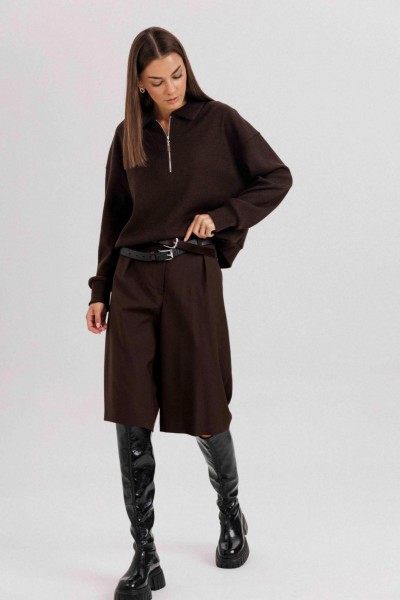 Комплект невероятно комфортный, в самом трендовом цвете сезона. Джемпер из трикотажа. Это одна из базовых вещей осенне-зимнего сезона. Он тёплый, удобный и невероятно комфортный. К тому же, настолько универсален, что его можно стилизовать абсолютно разными способами. Свободный покрой с заниженной линией плеча, рукав рубашечного покроя на отрезной манжете, воротник классический, по центру полочки частичная застёжка-молния. По низу джемпера - отрезной пояс. Бриджи классические, прямые, на отрезном поясе со шлевками, эластичном в области спинки. Передние половинки с талиевыми вытачками и наклонными боковыми карманами. Задние полоаинки с талиевыми вытачками и прорезным карманом с листочкой. Пояс в комплект не входит.