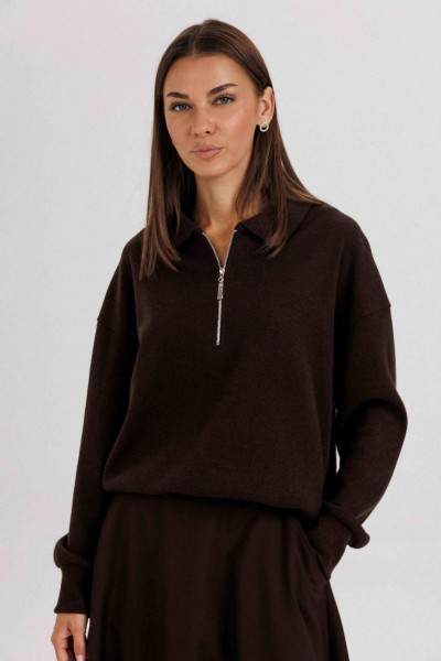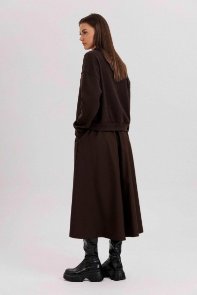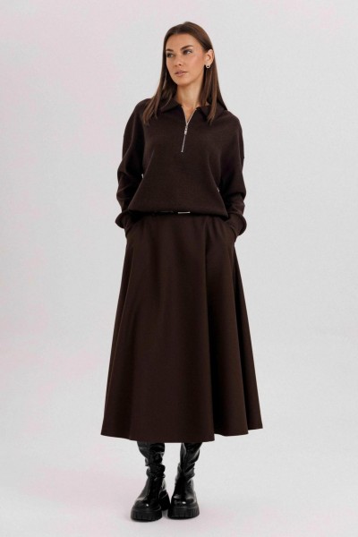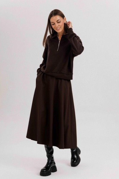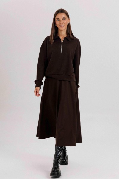 Комплект невероятно комфортный, в самом трендовом цвете сезона. Джемпер из трикотажа. Это одна из базовых вещей осенне-зимнего сезона. Он тёплый, удобный и невероятно комфортный. К тому же, настолько универсален, что его можно стилизовать абсолютно разными способами. Свободный покрой с заниженной линией плеча, рукав рубашечного покроя на отрезной манжете, воротник классический, по центру полочки частичная застёжка-молния. По низу джемпера - отрезной пояс. Юбка коническая, длины миди на притачном поясе, частично эластичном в области спинки. По боковым швам - наклонные карманы, застёжка по центру заднего полотнища на тесьму-молнию и петлю пуговицу. Поя в комплект не вхолит.