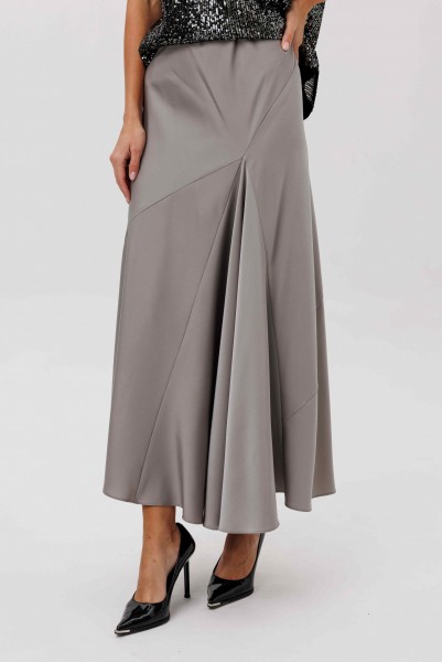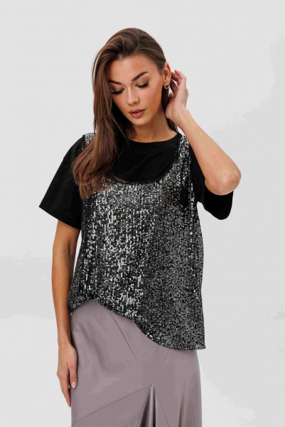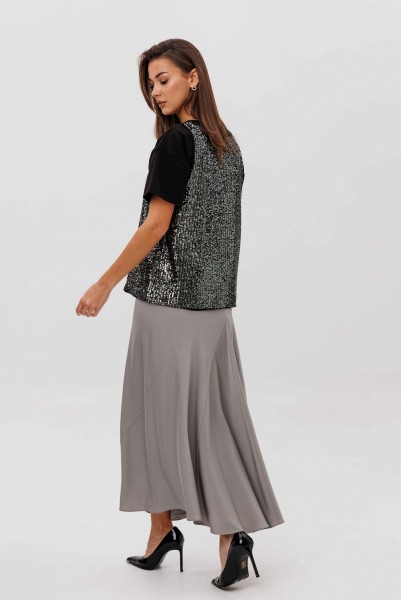 Тройка, созданная для выразительных и стильных образов. Эффектная юбка миди с асимметричными рельефами и конической вставкой из атласного полотна формирует красивую динамику в движении. Мягкая блуза-футболка из комфортного вискозного трикотажа дарит ощущение легкости и идеально балансирует сияние топа. Майка с пайетками добавляет образу яркость и праздничный акцент — носите ее как самостоятельный элемент или сочетайте со всей тройкой для максимального эффекта.