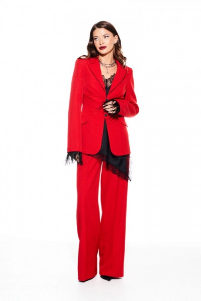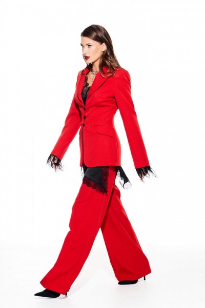 Жакет приталенного силуэта, с отложным воротником и лацканами пиджачного типа, с центральной застежкой на 3 навесные петли и 3 пуговицы, на подкладке. Перед отрезной, с рельефами, нагрудными вытачками, имитацией кармана с клапаном. Спинка со средним швом и рельефами. Рукав втачной, двухшовный, длинный. Низ рукава со съемной тесьмой из перьев.