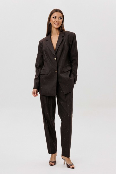 Брюки классического покроя с высокой посадкой на притачном поясе со шлёвками, зауженные. Застежка брючная на потайной крючок и молнию. Передние половинки брюк с мягкими складками-защипами и наклонными боковыми карманами. Задние половинки брюк с вытачками и прорезными карманами с листочками.