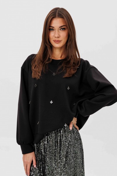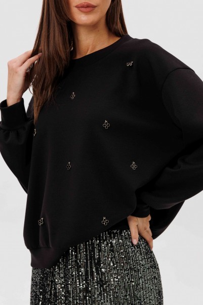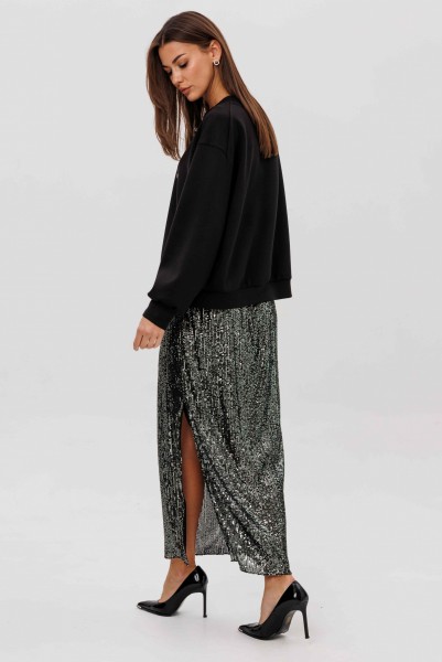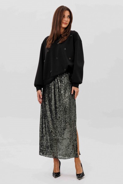 Стильный комплект, сочетающий уют и женственность. Мягкий свитшот из комфортного трикотажа украшен ручной расшивкой декоративными элементами в форме «клевера» — утончённая деталь, создающая акцент на естественной элегантности. Юбка выполнена из трендового полотна в пайетку. Юбка прямая, длинная на эластичном поясе и подкладке. Длина юбки около 90 см.