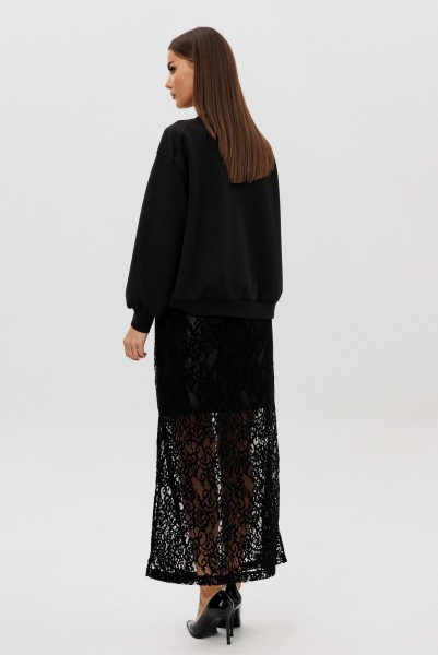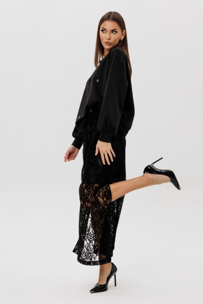 Стильный комплект, сочетающий уют и женственность. Мягкий свитшот из комфортного трикотажа украшен ручной расшивкой декоративными элементами в форме «клевера» — утончённая деталь, создающая акцент на естественной элегантности. Юбка выполнена из трендового шенилового гипюра с укороченной подкладкой, что придаёт образу лёгкость и современную многослойность.