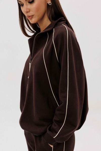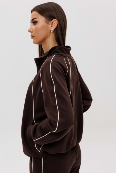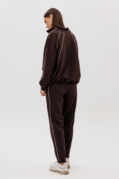 Джемпер покроя реглан с аккуратной стойкой и застёжкой-молнией украшен контрастными кантами, придающими образу динамику. Брюки со слегка зауженным силуэтом и манжетами по низу дополнены эластичным поясом для удобной посадки.