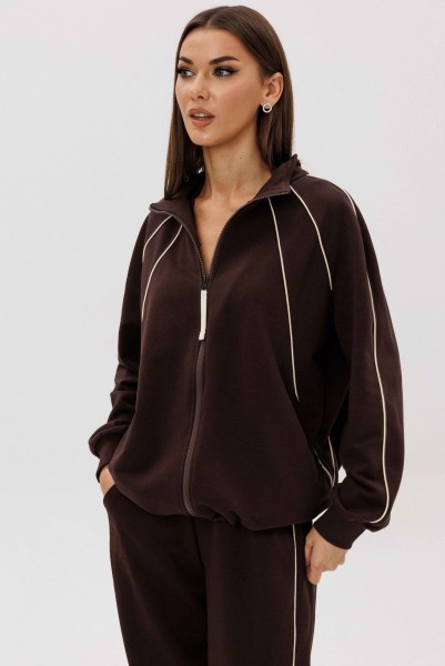 Современный костюм в стиле спорт-кэжуал — идеальный баланс комфорта и актуального дизайна. Модель выполнена из мягкого трикотажного полотна с добавлением хлопка, обеспечивающего приятные тактильные ощущения и свободу движений.
