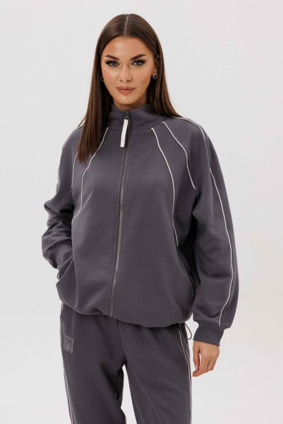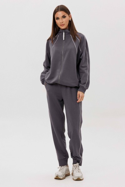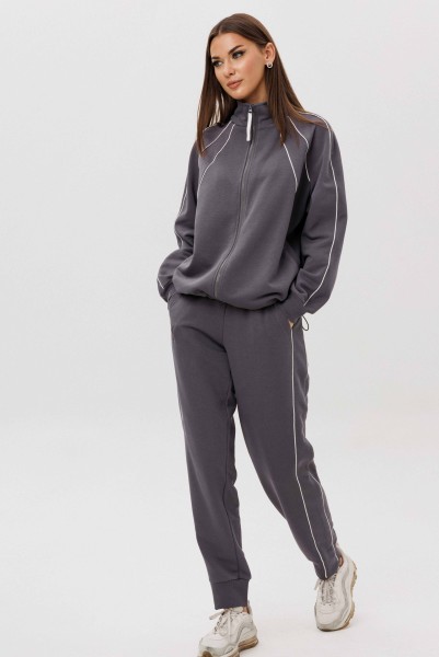 Джемпер покроя реглан с аккуратной стойкой и застёжкой-молнией украшен контрастными кантами, придающими образу динамику. Брюки со слегка зауженным силуэтом и манжетами по низу дополнены эластичным поясом для удобной посадки.