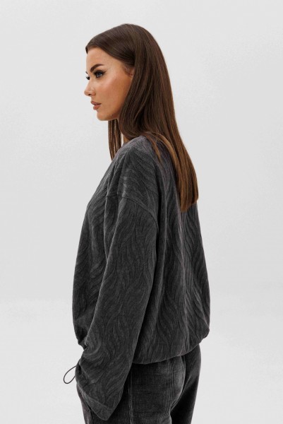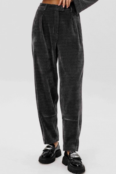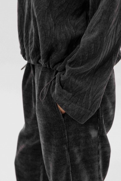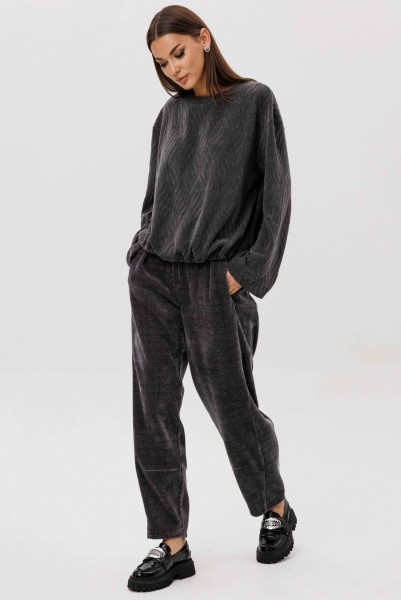 Свободный джемпер расширенного силуэта втачного покроя на заниженной линии плеча. Рукав расширенный в области оката. По низу джемпера шнур- резинка с фиксаторами. Брюки "баррел" на притачном поясе со шлёвками (эластичном в области спинки), с наклонными карманами , мягкими складками защипами по верху брюк.