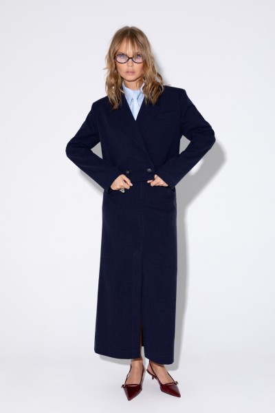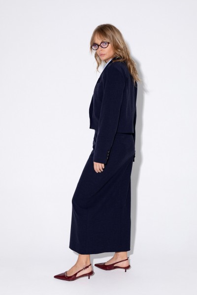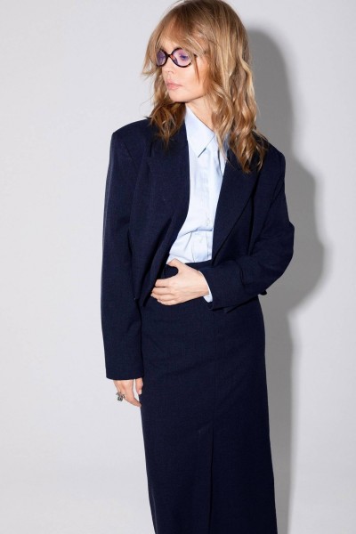 Костюм-двойка из укороченного оверсайз жакета с расширенной линией плеч и прямой макси-юбки с высоким разрезом.