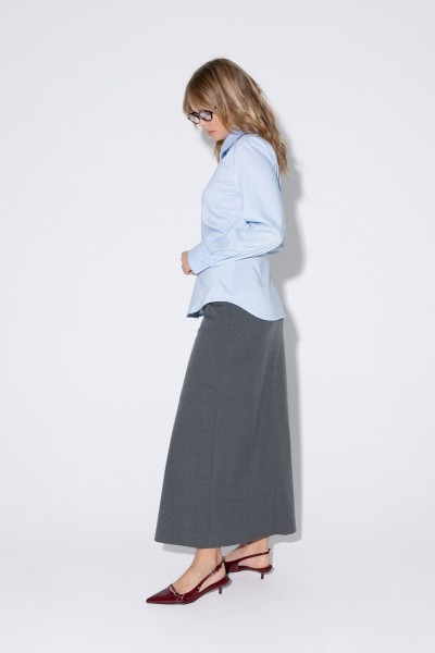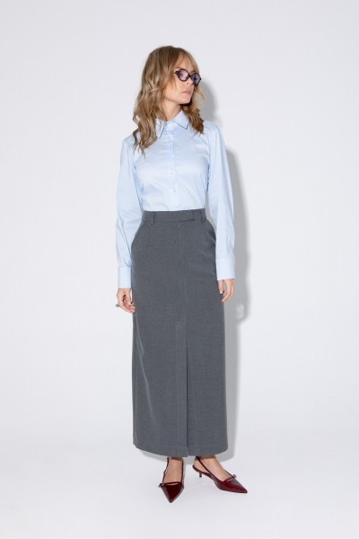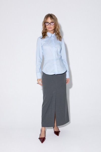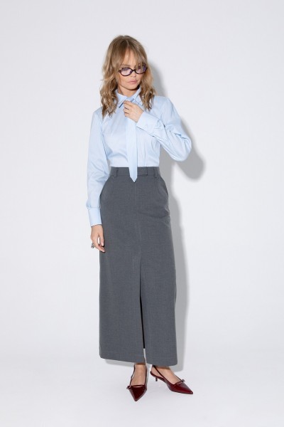 Комплект-двойка из приталенной хлопковой рубашки с галстуком и прямой макси-юбки с высоким разрезом.