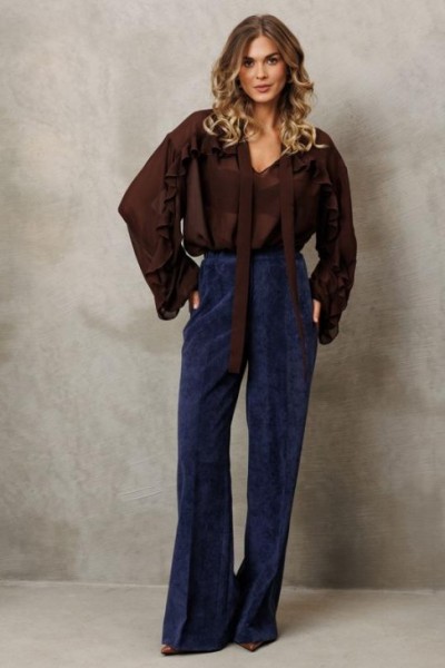 Брюки палаццо с притачным поясом из мягкой вельветовой ткани. Спереди застежка гульфик на молнии и петлей и пуговицей по поясу. По задней частям брюк вытачки. Пояс с резинкой в боковых частях. Брюки с заутюженными стрелками.