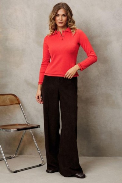 Джемпер приталенного силуэта с воротником поло из трикотажного полотна. Рукав втачной одношовный. Брюки палаццо с притачным поясом из мягкой вельветовой ткани. Спереди застежка гульфик на молнии и петлей и пуговицей по поясу. По задней частям брюк вытачки. Пояс с резинкой в боковых частях.