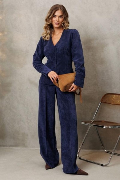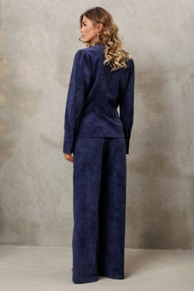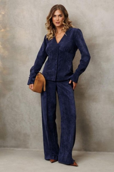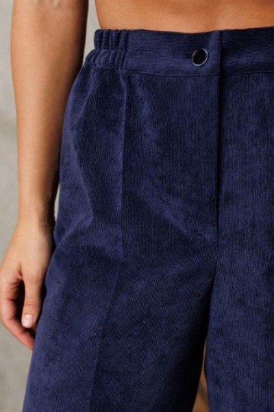 Брюки палаццо с притачным поясом из мягкой вельветовой ткани. Спереди застежка гульфик на молнии и петлей и пуговицей по поясу. По задней частям брюк вытачки. Пояс с резинкой в боковых частях. Брюки с заутюженными стрелками.