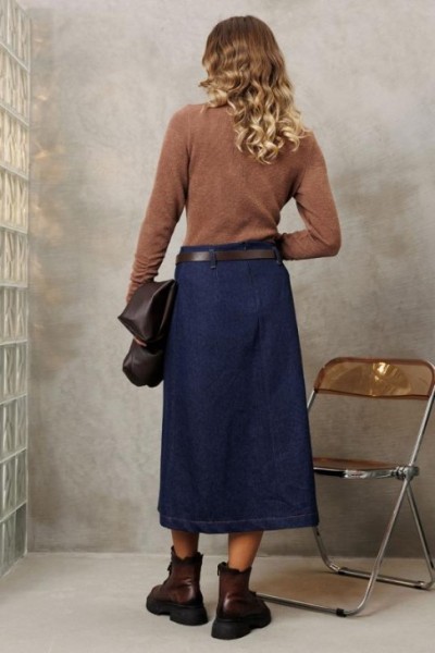 Юбка А-образного силуэта из плотного джинса. Передняя часть юбки со средним швом. С правой стороны вверху настрочен карман с клапаном- шлевкой. Задняя часть юбки со средним швом и вытачками. Сверху в среднем шве обработана потайная молния. Вдоль линии пояса настрочены шлевки. Пояс цельнокроеный на обтачке. Юбка на подкладке. Вдоль среднего шва по переду и по периметру кармана проложена декоративная строчка. К юбке прилагается сьемный ремень.