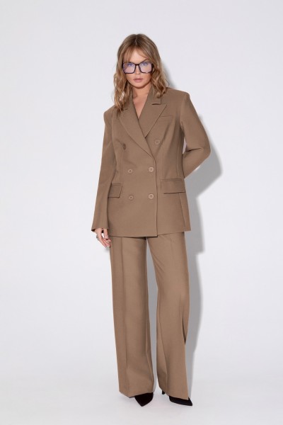 Текстильный костюм-двойка из свободного жакета и прямых брюк со стрелками.