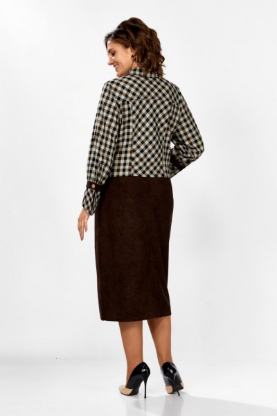 Женский комплект, состоит из жакета и юбки. Жакет выполнен из текстильной ткани в клетку, в качестве отделки штрукс. Горловина обработана воротником со стойкой, застежка по переду на пуговицы. На полочке обработаны рельефы и кокетки, также на полочке обработан накладной карман с клапаном из штрукса по одной стороне, по второй нашивка. Спинка идентична полочке, рукав втачной, по низу с манжетой из штрукса и текстиля в клетку, застегивается на пуговицу. Юбка выполнена из штрукса, с застежкой по переду на планку с пуговицами. Верхний срез обработан притачным поясом, по переду обработаны вертикальный подрезы и карманы. Заднее полотнище юбки со средним швом и вытачками. Эффектный и стильный комплект для вашего осеннего образа! Длина блузки 50см, длина юбки 78см.В 52р Блузка: Ширина груди- 56см, Ширина талии -54см, ширина бедер -см, длина рукава- 58см, ширина рукава 20см.