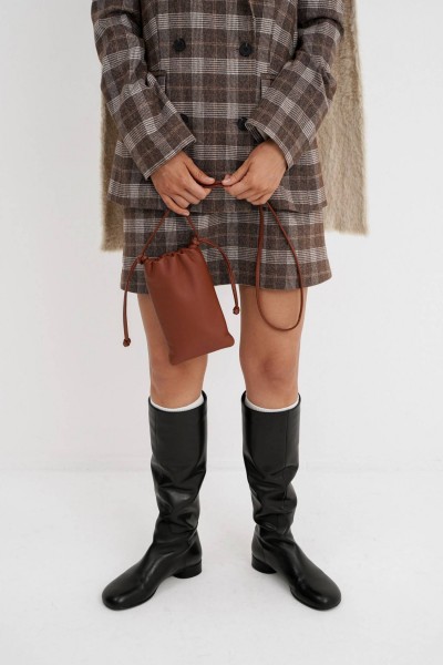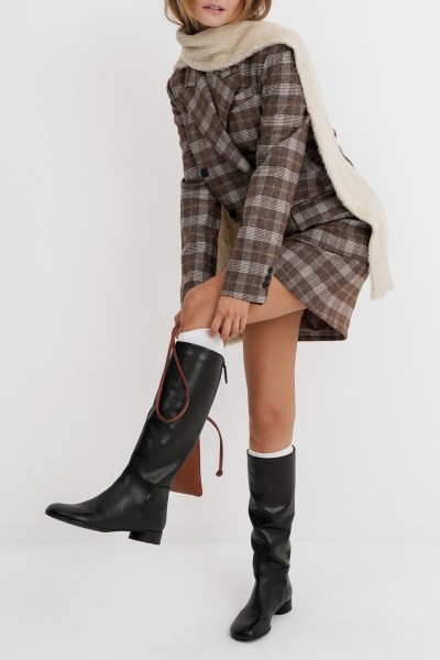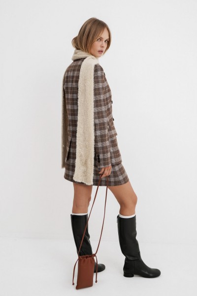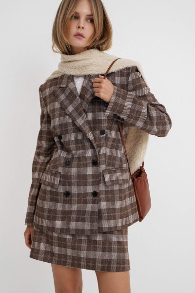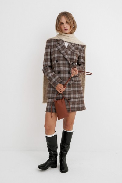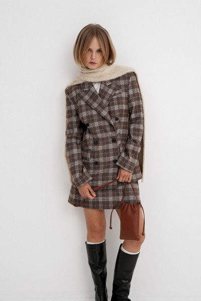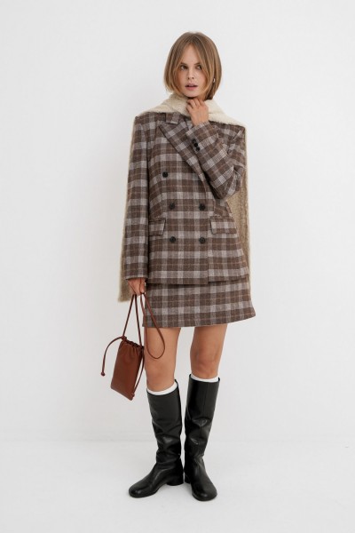 Костюм-двойка из свободного жакета и мини-юбки из текстильной ткани в клетку.