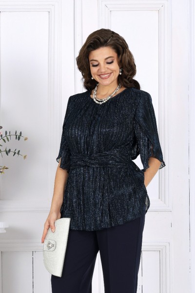 Блузка выполнена из изысканной сетки-гофре с люрексом, которая мягко переливается при каждом движении, создавая благородное сияние. Внутренняя трикотажная подкладка обеспечивает комфорт и делает посадку идеальной даже для полных женщин. Фигурный крой и драпированный пояс с перекрутом формируют женственный силуэт — акцентируют талию, визуально вытягивая фигуру и делая её стройнее. Рукава особого фасона с разрезом добавляют легкости и движения образу, придавая наряду современное звучание и ощущение воздушности.