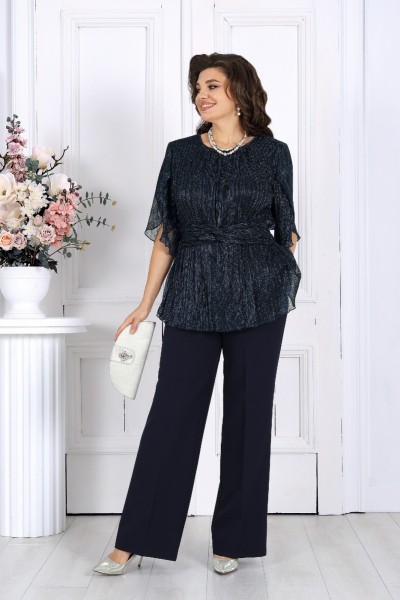 Этот костюм станет вашим универсальным решением: праздничный вечер, деловая встреча, торжественный ужин или новогодний приём — он уместен везде. Блузка с благородным мерцанием делает образ утончённым и эффектным, придавая нотку торжественности без излишнего блеска.
