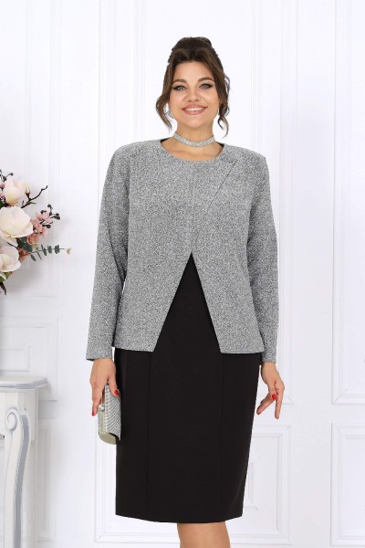 Платье полуприлегающего силуэта, выполнено из костюмно-плательной ткани. Модель на трикотажной подкладке, с плечевыми накладками. Перед и спинка с рельефными швами, направленными от проймы до низа. В верхней части среднего шва спинки обработана застежка на потайную тесьму-«молнию» (50см); в нижней части шва – шлица. Горловина округлой формы, спереди углубленная. Рукав втачной, короткий. Длина платья – 104 см; длина рукава – 25 см.