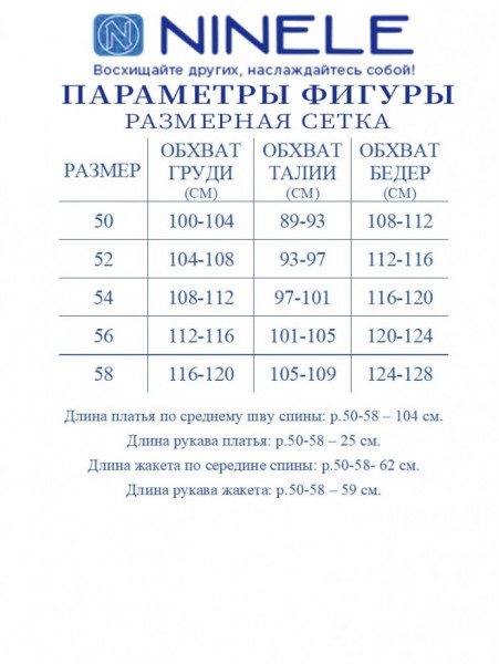Жакет полуприлегающего силуэта, выполнен из трикотажного полотна с фактурной лицевой стороной «люрекс». Модель на трикотажной подкладке, с плечевыми накладками. Перед с нагрудными вытачками, направленными от проймы; спинка – с талиевыми. Фигурные борта фиксируются на запах по линии горловины при помощи внутренней застежки на 2 петли и 2 потайные пуговицы и внешней застежки - на 2 петли и 2 декоративные пуговицы, обтянутые основным материалом. Горловина округлой формой, спереди углубленная. Рукав втачной, длинный. Длина жакета – 62 см; длина рукава – 59 см.